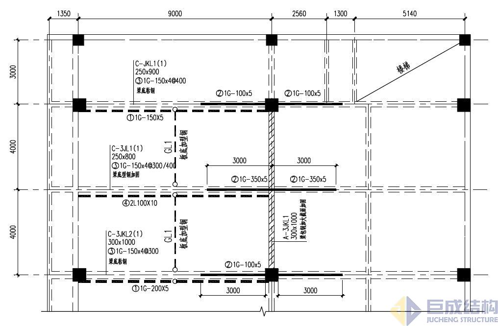 2)粘結型鋼改變傳力途徑加固法:適用于原結構樓面荷載大幅度提高或增加較大局部荷載,通過在板底粘型鋼改變傳力途徑或減小跨度提高樓板承載力;