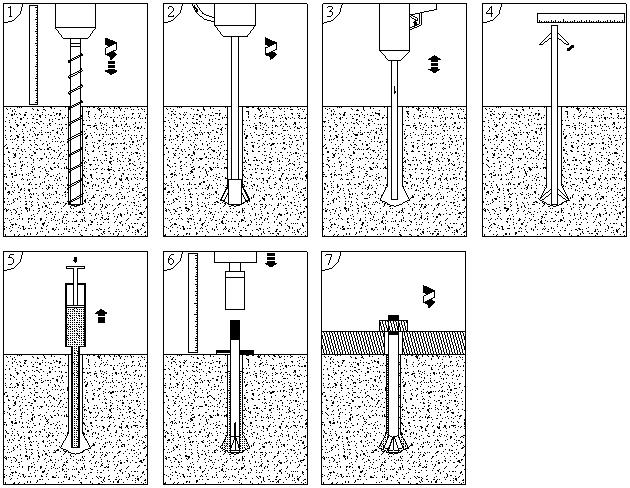 鉆直孔→底部擴(kuò)孔→清孔→測(cè)量擴(kuò)孔→注漿→安裝錨桿→連接與安裝