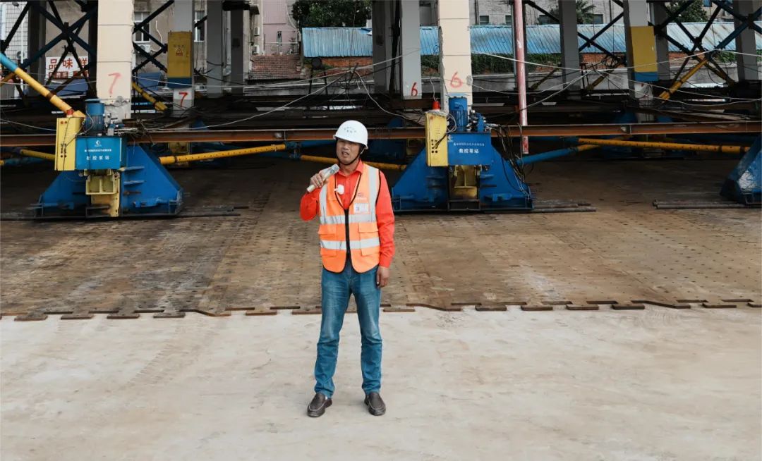 巨成公司副總經理廖杰洪首先對項目情況做了介紹。本次移位工程共包括四個步驟,先將大樓旋轉28度,平移99米;再旋轉28度,再平移106米。移位工程采用了巨成獨立知識產權的專利技術:鋼滑道剛性平面軸心旋轉法進行旋轉,鋼滑道頂推平移法進行平移。第一次旋轉28度用時7天,第一次平移99米用時10天。經過方案優化,第二次旋轉28小時旋轉28度;第二次平移3天平移106米,創造了一天平移45米的壯舉。消防大樓的移位工程取得圓滿成功!巨成鋼滑道剛性平面軸心旋轉法和鋼滑道頂推技術工程應用取得圓滿成功!